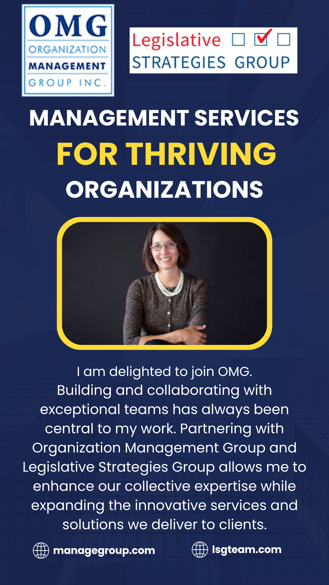 “I am delighted to join OMG,” said Ms. Hellebush. “Building and collaborating with exceptional teams has always been central to my work. Partnering with Organization Management Group and Legislative Strategies Group allows me to enhance our collective expertise while expanding the innovative services and solutions we deliver to clients.”